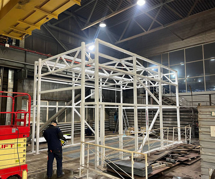 Рабочая зона камеры сформирована металлическим силовым каркасом, обшитым сэндвич-панелями толщиной 100 мм с заполнением из минеральной ваты на основе базальтового волокна, что обеспечивает эффективную теплоизоляцию и соответствие требованиям пожарной безопасности. Внутренние габариты составляют 4300 × 2800 × 3000 мм.